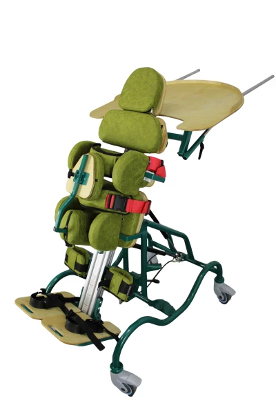 Базовый комплект включает многофункциональный вертикализатор с металлической рамой и с поворотным ложем со съемными модулями, раздельными подножками со стоподержателями, абдуктором, съемным столиком, системой креплений и боковыми упорами. Пневматический привод.
