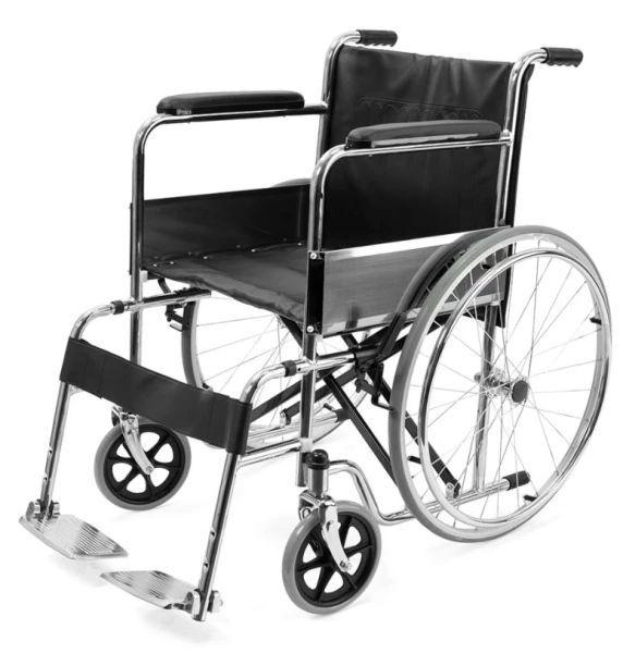 Кресла-коляски инвалидные складные предназначены для передвижения больных и инвалидов с частичной потерей функций опорно-двигательного аппарата в условиях помещений и на площадках с твёрдым покрытием для преодоления незначительных расстояний. Усиленная двойная рама FS874 выполнена из стали с хромовым покрытием. Конструкция имеет вращающиеся опоры стоп.