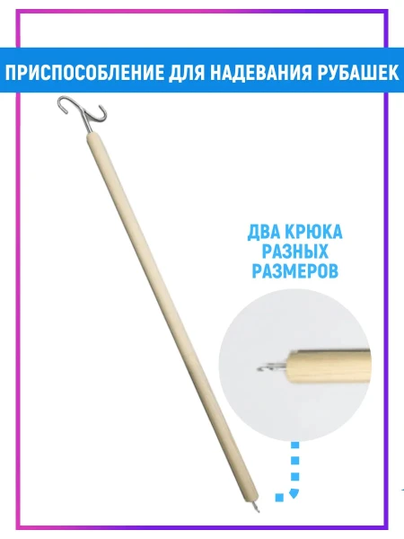 Устройство для облегчения одевания рубашки в виде деревянной рукоятки с большим крюком формы "S" с одной стороны и специальным захватом с другой стороны
