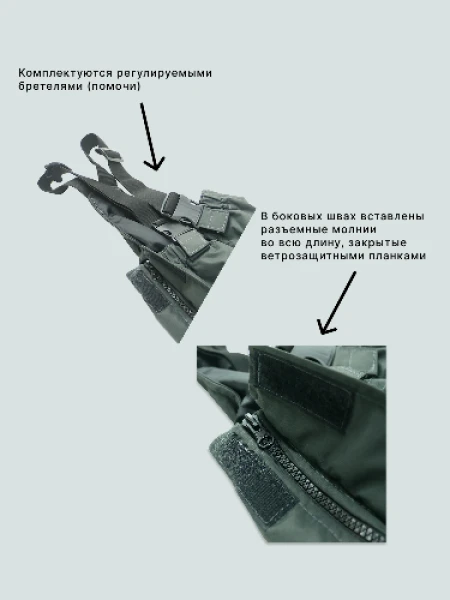 В боковые швы вставлены молнии, закрытые ветрозащитными планками.