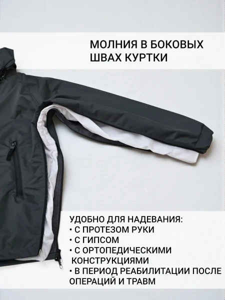 Куртка-ветровка адаптивная предназначена для использования людьми, перенесшими травмы, хирургические операции, а также заболевания с ограничением подвижности плечевого пояса и верхних конечностей. Подходит для пожилых людей с возрастными изменениями опорно-двигательного аппарата. Ветровка оснащена передней магнитной молнией, которая облегчает застегивание при сниженной функции рук. Молнии по боковым швам с продолжением на внутреннюю сторону рукавов позволяют надевать и снимать куртку самостоятельно.
