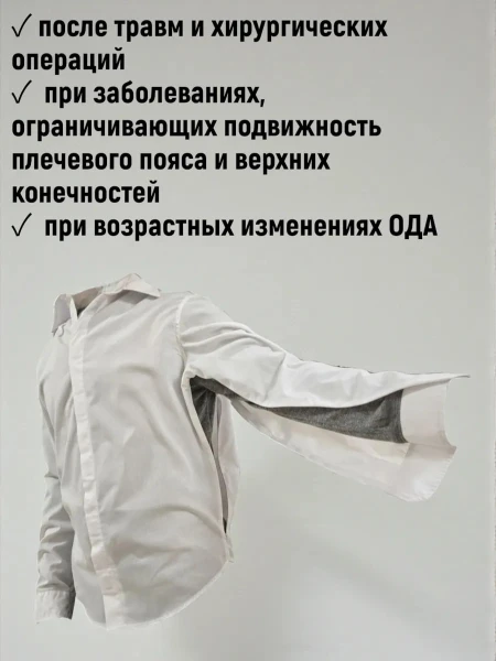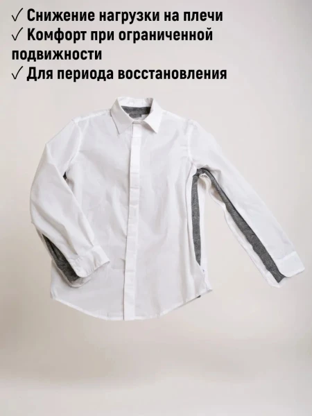 Адаптивная мужская рубашка для людей с ограниченной подвижностью плечевого пояса и верхних конечностей — функциональная повседневная одежда для восстановления после травм, хирургических операций и при возрастных изменениях опорно-двигательного аппарата. Рубашка разработана с учетом потребностей при сниженной подвижности рук: минимальные требования к движению рук и плеч, облегчённое надевание и раздевание за счёт основной магнитной кнопки и боковых молний с переходом на рукава.