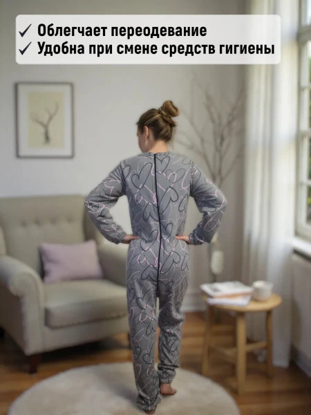 Адаптивная пижама женская для лежачих больных и малоподвижных пациентов предназначена для ежедневного ухода и повседневной носки. Конструкция изделия предусматривает застёжку-молнию по среднему шву спинки, что облегчает переодевание и позволяет быстро менять средства гигиены без лишнего дискомфорта для пациента.