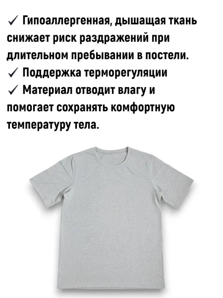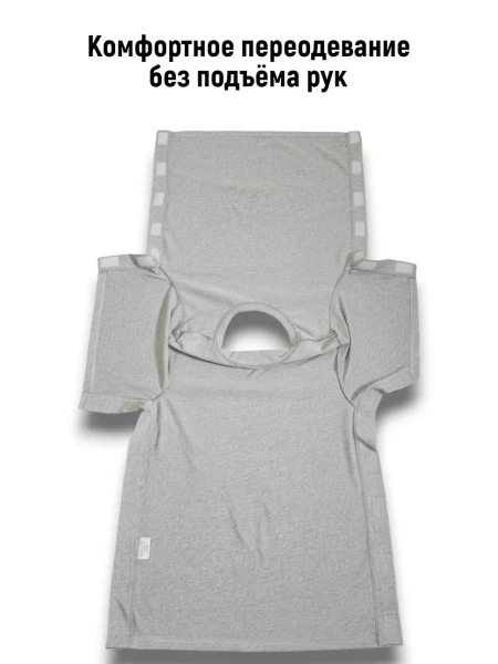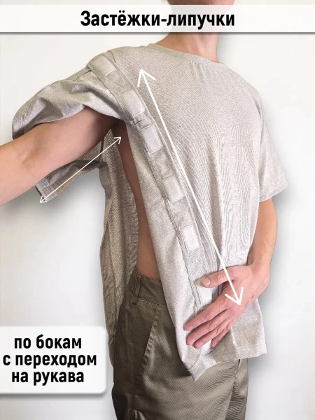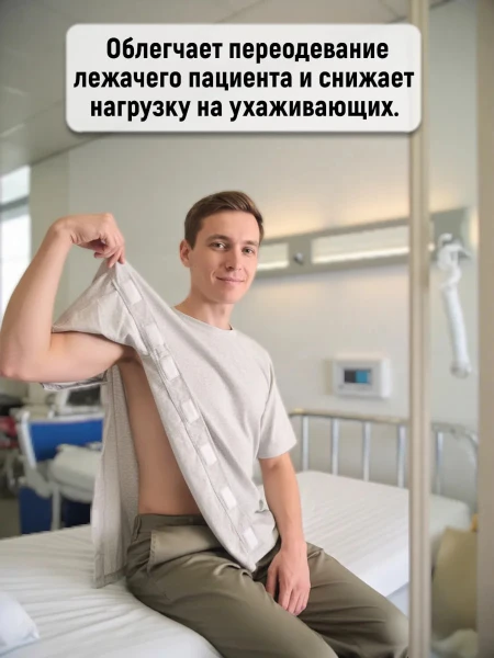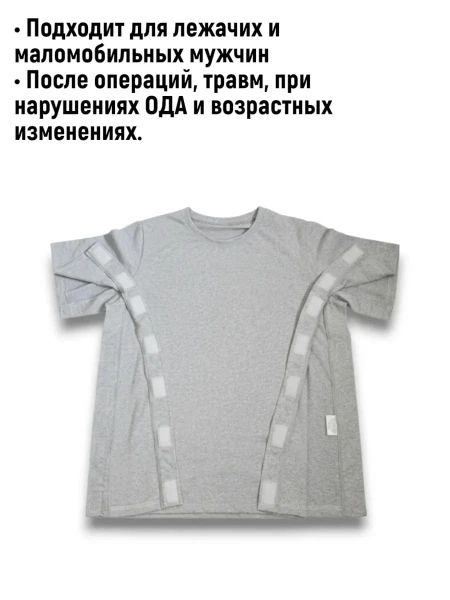 Футболка адаптивная мужская для лежачих больных и инвалидов — специализированная одежда для маломобильных пациентов, созданная для ухода, реабилитации и домашнего ношения. Подходит для мужчин после операции, травм, инсульта, при нарушениях опорно-двигательного аппарата и возрастных изменениях. Футболка облегчает переодевание лежачего пациента и снижает нагрузку на ухаживающих. Конструкция с застежками-липучками по боковым швам с переходом на рукава позволяет аккуратно надеть футболку без подъёма рук.