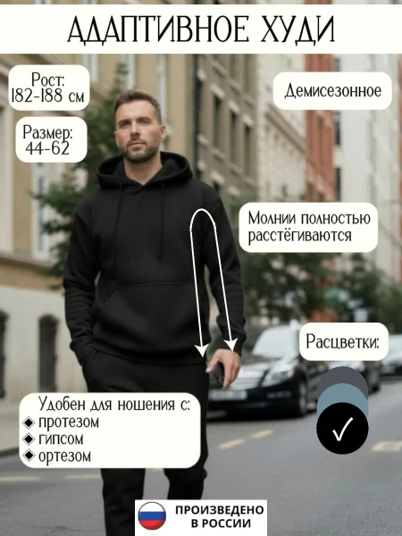Адаптивный пиджак предназначен для пациентов после травм и хирургических операций, для людей с ограниченной подвижностью верхних конечностей и плечевого пояса, а также для пожилых и маломобильных пациентов. Одежда для инвалидов может использоваться при ношении ортезов, протезов и внешних фиксирующих аппаратов, включая Аппарат Илизарова. Конструкция с магнитными застежками спереди и потайными молниями по бокам корпуса и внутренней части рукавов обеспечивает легкое надевание и снятие пиджака.