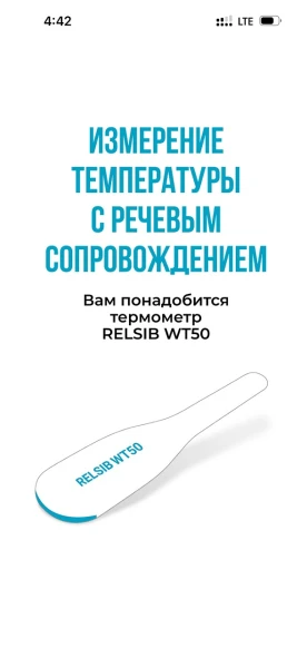 Медицинский термометр Relsib WT50 используется с мобильным приложением Talking Thermometer Relsib по Bluetooth 4.0. В Мобильном приложении показания дублируются голосовыми сообщениями. Термометр сообщает и показывает на экране смартфона измеренную и текущую температуру, сообщает данные предыдущих измерений (история). Громкость речевых сообщений можно регулировать на телефоне. Приложение максимально простое и удобное.