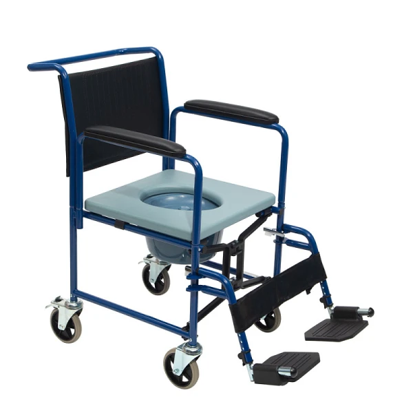 Компактное и удобное кресло-каталка с санитарным оснащением представляет собой стул туалет на четырех колесах диаметром 100 мм, откидными удлиненными подлокотниками и съемными подножками. Кресло туалет предназначено для принятия гигиенических процедур инвалидам с ограниченными физическими возможностями и пожилым людям. Для удобства пересаживания пользователя задние колеса оснащены стояночными тормозами. На подножках установлены колесики-бамперы.